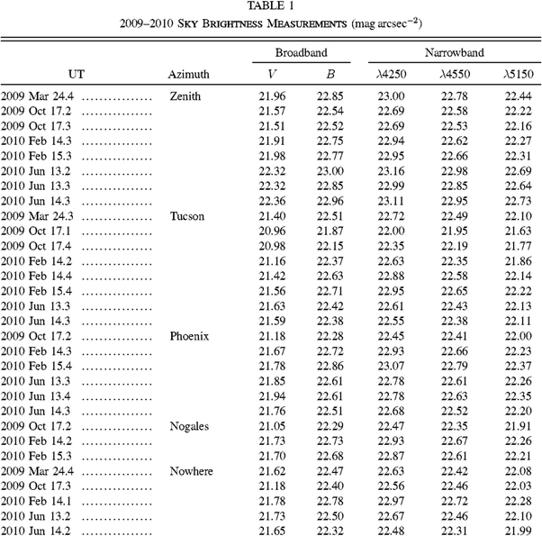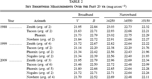 While the arid conditions of southern Arizona failed to stem the region's growth, our results show that the sky brightness has not increased proportionally with the population. Over the last two decades, both Pima and Maricopa Counties (which contain Tucson and Phoenix, respectively) have nearly doubled in size, and the city of Nogales and Santa Cruz County have experienced similar trends.2 However, Pima County's 1974 lighting ordinance, and its successors in 1987, 2000, and 2005, along with similar regulations imposed by the city of Tucson, have effectively stopped the impact of household, commercial, and outdoor lights on the night sky. According to the Pima County Report (Davis et al. 2006), light pollution at Kitt Peak has stabilized at 2005 levels and is expected to stay constant until at least 2030. Additionally, in 1974, Turnrose published absolute spectrometry of the Palomar night sky, at a time when Palomar was considered one of the premiere dark observing sites. His λ4540 flux is equivalent to 22.30 mag arcsec-2, which is comparable to our λ4550 magnitudes presented in Table 2. Thus, Kitt Peak is currently just as dark as Palomar was in the mid-1970s.