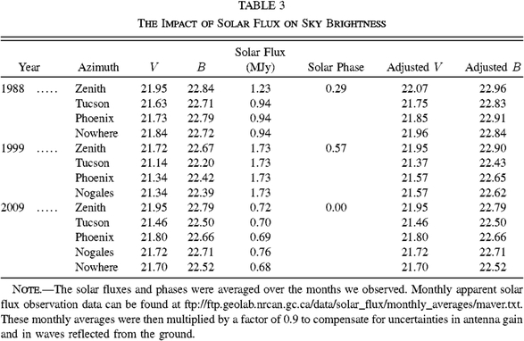 In an attempt to correct for the effects of the solar cycle on our data, we scaled our V and B magnitudes to the solar minimum using the knowledge that the sky gets brighter by ∼0.4 mag between the solar minimum and the solar maximum (Benn & Ellison 1998, Pedani 2009), and the "solar phases" (based upon the solar flux) when our observations were taken. These results are shown in Table 3 and suggest that while the observed sky brightness is comparable to what it was in 1999 (especially considering our 0.04 mag error), the sky has brightened at zenith by approximately 0.1 mag since 1988. Similarly, these corrected data suggest that while the sky toward both Tucson and Nowhere has increased in brightness by approximately 0.3 mag in V and B since 1988, they are actually ∼0.1 mag darker than they were in 1999. One needs to recall that these corrections are approximate, but they help place the measurements on a uniform (if hypothetical) basis. Still, the data are certainly very supportive of the view that lighting ordinances have been an effective tool despite the population growth.
