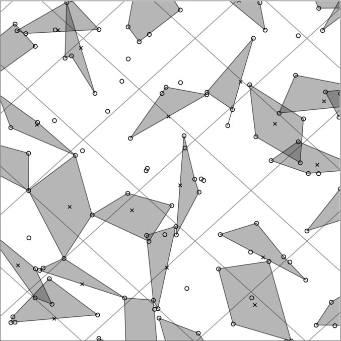 times the side-length of the grid cells. In each grid cell, the system attempts to build a quad whose center (i.e., midpoint of the diameter line)—marked with an × in the figure—is within the grid cell.