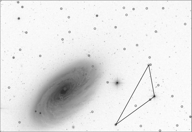 Figure 5. Sample query image, with the brightest 100 sources our system detects (circles), and a quad in the image to which our system will search for matches in the index. This quad looks like a triangle because two of its stars are nearly collinear. Image credit: SDSS.