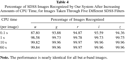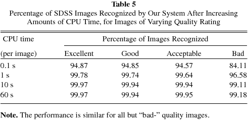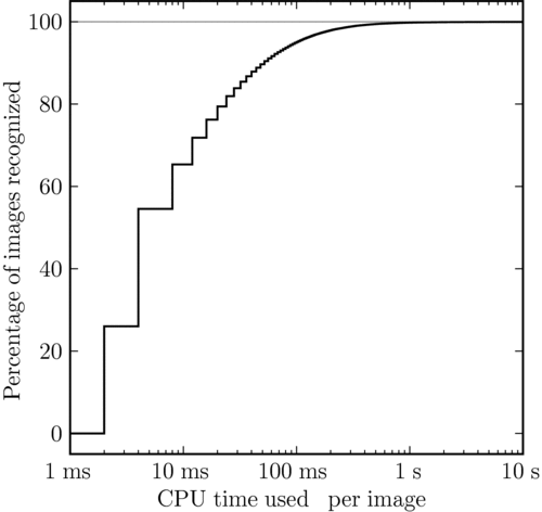 The results, shown in Table 3 and in Figures 9, 10, 11, and 12, are that we can successfully recognize over 99.97% of the images, spending up to 10 s of CPU time per image. The majority of images are recognized after only 0.1 s of CPU time per image.