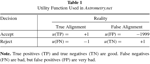 The final component of Bayesian decision theory is the utility table, which expresses the subjective value of each outcome. It is good to accept correctly a true match or reject correctly a false match ("true positive" and "true negative" outcomes, respectively), and it is bad to reject a true match or accept a false match ("false negative" and "false positive" outcomes, respectively). In the Astrometry.net setting, we feel it is very bad to produce a false positive: we would much rather fail to produce a result rather than produce a false result, because we want the system to be able to run on large data sets without human intervention, and we want to be confident in the results. Our utility table is shown as Table 1.