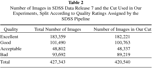Table 2. Number of Images in SDSS Data Release 7 and the Cut Used in Our Experiments, Split According to Quality Ratings Assigned by the SDSS Pipeline
