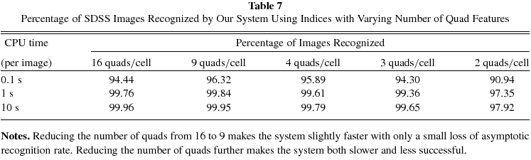 As shown in Table 7 and Figure 19, reducing the density from 16 to 9 quads per HEALPix grid cell has almost no effect on the recognition rate but takes only two-thirds as much CPU time. Reducing the density further begins to have a significant effect on the recognition rate, and actually takes more CPU time overall.