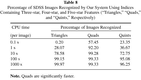 Standard image High-resolution imageTable 8. Percentage of SDSS Images Recognized by Our System Using Indices Containing Three-star, Four-star, and Five-star Features ("Triangles," "Quads," and "Quints," Respectively)