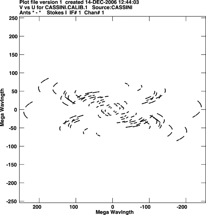 Figure 2. (U, V) sampling for Cassini during our first epoch. The sampling for the phase reference source is nearly identical.