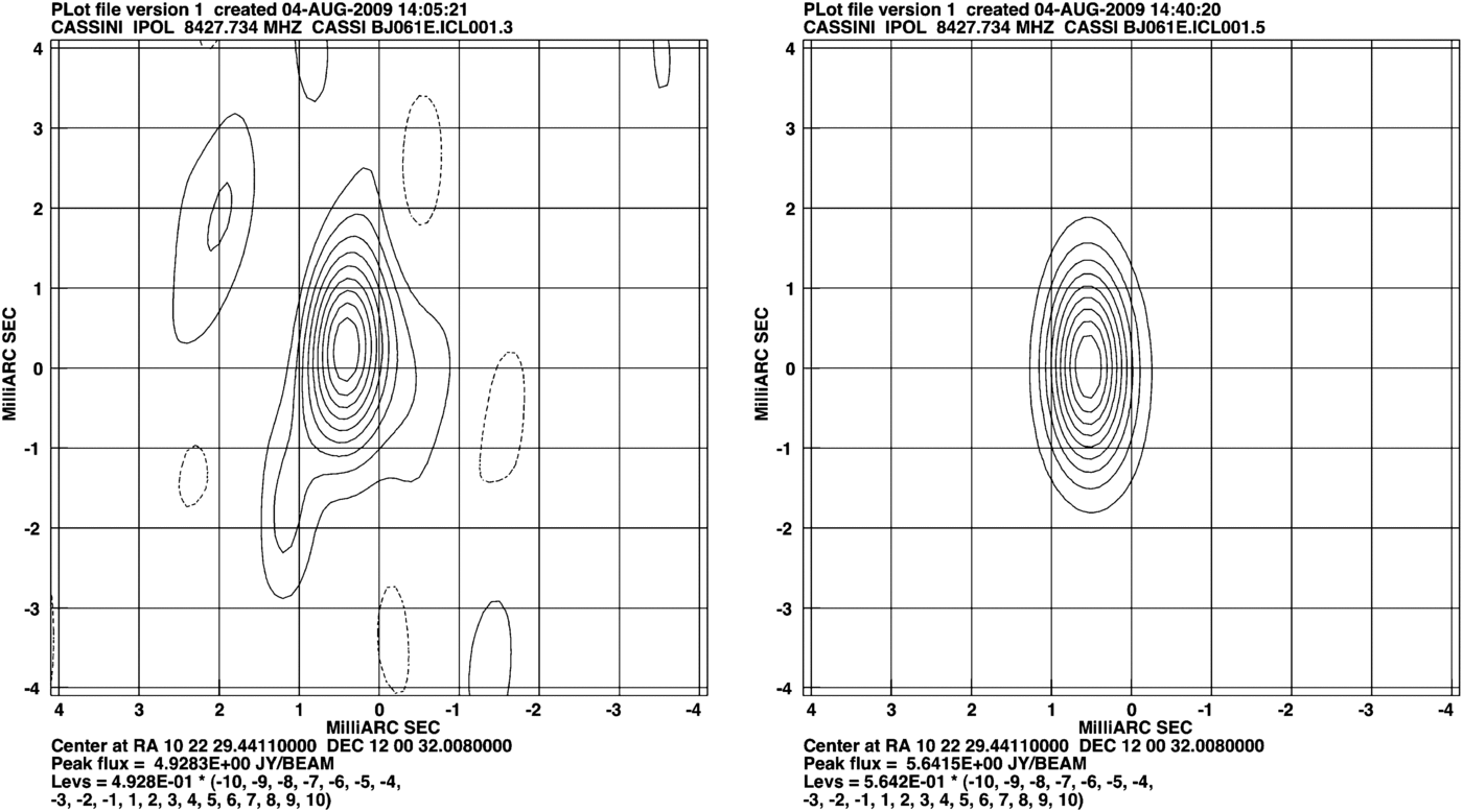 Figure 3. Effect of manual troposphere delay calibration. The left panel is the phase-referenced Cassini image from epoch five without troposphere calibration. The right panel shows the improvement when troposphere delays were estimated for each antenna using calibrators observed over a wide range of elevation angles. Note the reduction in scattered power and the higher peak flux density (4.93 Jy beam−1 on left, 5.64 Jy beam−1 on right). Note also the small shift in declination between the two images.
