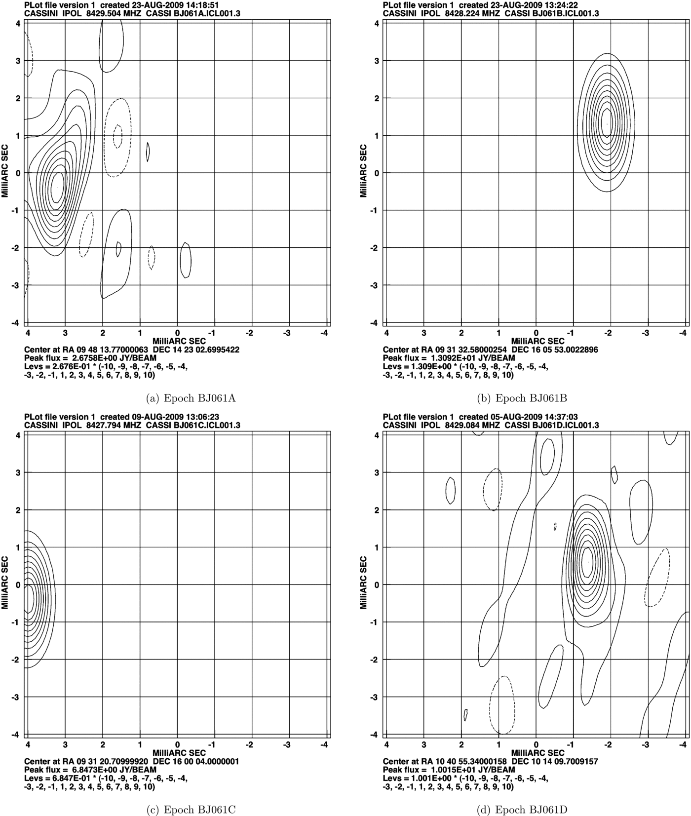 Standard image High-resolution imageFigure 5. Phase-referenced images of Cassini from the last four epochs. The peak flux densities are 5.64 Jy beam−1 (upper left), 3.04 Jy beam−1 (upper right), 5.73 Jy beam−1 (lower left), and 10.83 Jy beam−1 (lower right). In all cases the contour levels are −20%, −10%, 10%, 20%, 30%, 40%, 50%, 60%, 70%, 80%, and 90% of the peak flux density.