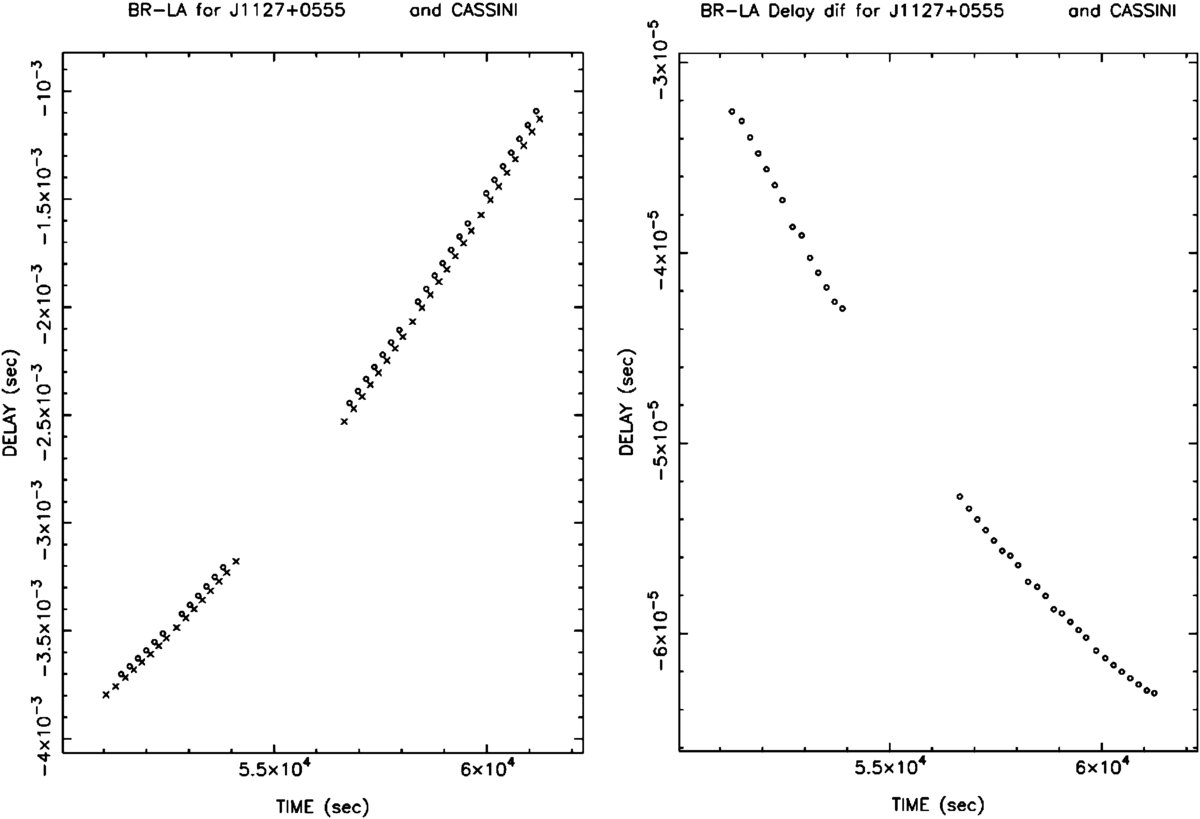 Figure 6 shows an example of the observed total delays for Cassini and the phase reference source on one baseline and the difference in total delays between Cassini and the reference source based on interpolation to identical times. The variation in differential delay during an observing epoch defines the angular offset between Cassini and the phase reference source.