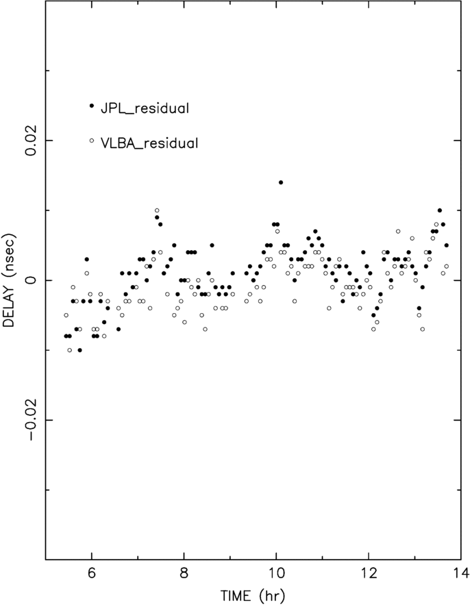 Figure 7 shows a comparison of the residual delays on one baseline (BR–FD) from one epoch (2009 February), illustrating the level of consistency between the two data analysis paths. The differences are ∼2 ps, which is comparable to the numerical precision expected from interpolating the planetary ephemeris for Saturn. (The JPL ephemeris is integrated in quadruple precision, but the results are stored in double precision so the numerical noise in the ∼5000 lt-s distance to Saturn is a few picoseconds.) The overall slope from about −5 ps to +5 ps during this epoch corresponds to the residual Cassini position offset from the a priori position and is clearly seen equally in the delays from both analyses.