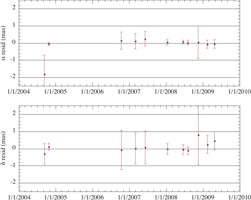 Table 7 gives the post-fit residuals for each epoch in Table 6 with respect to the DE422 ephemeris, which was fitted to the VLBA data. For comparison, residuals are also given with respect to the widely used DE405 ephemeris.