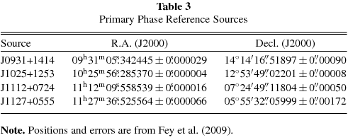 Table 3 shows the ICRF2 positions of our primary phase reference sources. The maximum difference between our a priori reference source positions and the ICRF2 positions is 0.16 mas (for J0931+1414 in right ascension); all other position differences are less than 0.1 mas. Note, however, that the ICRF2 position errors vary by more than an order of magnitude between sources. Future observations will continue to improve the less accurate source positions.