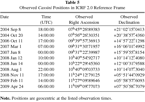 Table 5 lists the positions of the Cassini spacecraft determined from the VLBA total delay measurements, analyzed at JPL. This table includes two additional epochs from VLBA experiment BR103 in 2004 and an epoch in 2009 February from Fomalont et al. (2010). We included data from the 2004 and 2009 February observations because they used the same observing technique and instrumentation to determine astrometric positions for Cassini as the BJ061 experiments used.