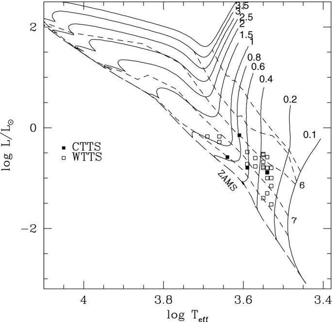 In Chamaeleon I, the selected fields focused on two CTTS with disks showing evidence for inner clearing, SZ Cha (T6), and T35 (Kim et al. 2009). We detected 15 known T Tauri stars in the two fields (out of ∼60 X-ray sources identified by WAVDETECT), five of which are accretors (Luhman 2004). The sources are listed in Table 1 and their positions in the H-R diagram are shown in Figure 1 based on spectral types and luminosities from the literature (see references in Table 1). Using the evolutionary tracks of Siess et al. (2000), we determine that the sample covers a large range of T Tauri masses from a 1 to 1.5 M☉ upper limit down to almost substellar masses, with a lower limit of 0.1–0.2 M☉. This mass range is similar to that used in Preibisch & Feigelson (2005), in which the evolution of X-ray emission in the low-mass population of the COUP sources was analyzed.