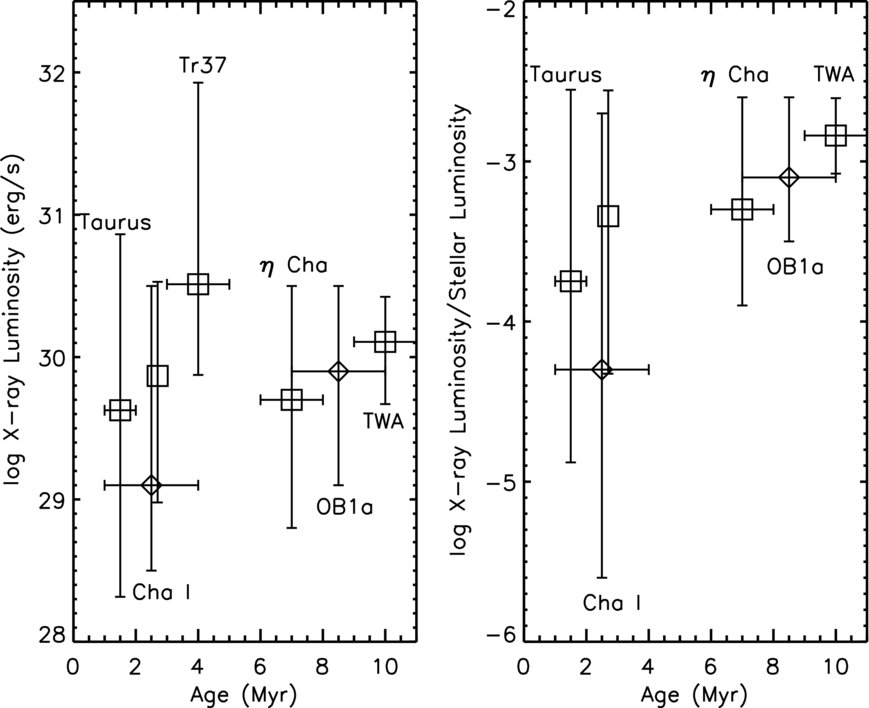 Figure 6. Left panel: median X-ray luminosities of young star-forming associations vs. age. For each association, we plot the median and the full range in X-ray luminosity for sources with spectral types K5 and later. The diamonds represent X-ray luminosities calculated in this work and the boxes represent those taken from the literature: Taurus (Güdel et al. 2007), Cha I (Feigelson et al. 1993), Trumpler 37 (Mercer et al. 2009), η Cha (Lopez-Santiago et al. 2010), and TWA (Voges et al. 1999, 2000). We include the sample of Feigelson et al. (1993) for Cha I (offset in age for clarity) because with only two fields observed here, the Cha I sample was limited. Our Cha I observations reproduce the range observed by ROSAT well and actually probe dimmer X-ray sources. Right panel: normalized X-ray luminosity vs. age. Here, we divide the observed X-ray luminosities by the stellar luminosities to normalize by spectral type. Both figures show that between 1 and 10 Myr, there is no decline in X-ray luminosity.