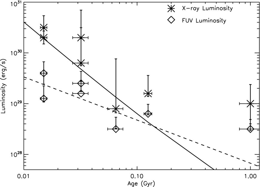 Standard image High-resolution imageOur young solar analogs extend the radiation evolution observed in Ribas et al. (2005) to younger ages, and agree with their result that the higher energy radiation fields decline more quickly than the cooler fields. Combining our results with those of Ribas et al. (2005), we see evidence that even past the 10 Myr time period for disk dispersal and planet formation, high-energy fields strongly in excess of the solar values persist and may have an effect on evolving disks and planets.