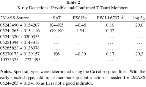 Notes. Spectral types were determined using the Ca i absorption lines. With the early spectral type, additional membership confirmation is needed for 2MASS 05244265 + 0154116 as Li is not a good indicator.