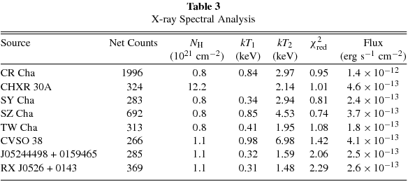 Instead, our results are consistent with the two-temperature coronal emission observed in Pleiades sources (Briggs & Pye 2003); however, for Chamaeleon, the temperatures of the hot component are approximately two times higher than the hot components in the Pleiades sources. This may be indicative of theorized cooling coronal gas, producing a softer spectrum as X-ray sources evolve (Kastner et al. 2003). The results of our spectral analysis show that we can use the same treatment to find X-ray luminosities for both the WTTS and CTTS since we see no evidence for an accretion related component.