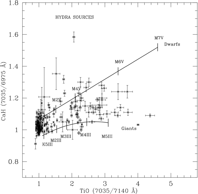 Figure 3. Plot of the CaH vs. TiO indices as defined in the text for 136 program objects. The solid lines were derived from fits to dwarf and giant spectral standards. For the dwarf standards from K5-M7, the fit was y = 0.126x + 0.940 with a correlation coefficient of r = 0.94. We note that for spectral types later than M7, both indices decrease in response to an overall depression of the continuum so that an M8 V star has a CaH index similar to that of an M4 V star. For the giant standards from K5-M5, the fit gave y = −0.0357x2 + 0.191x + 0.795 with a correlation coefficient of r = 0.82.