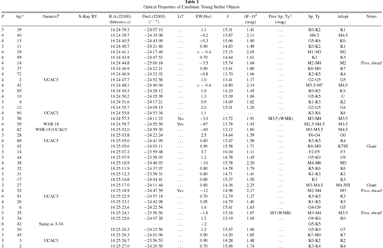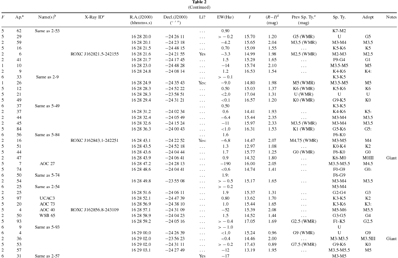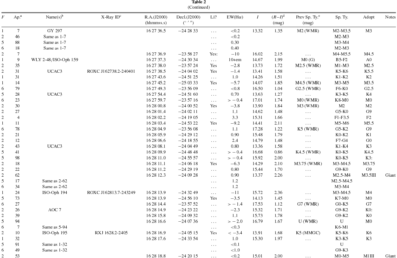| F | Ap.a | Name(s)b | X-Ray IDc | R.A.(J2000) | Decl.(J2000) | Li? | EW(Hα) | I | (R−I)d | Prev Sp. Ty.e | Sp. Ty. | Adopt | Notes |