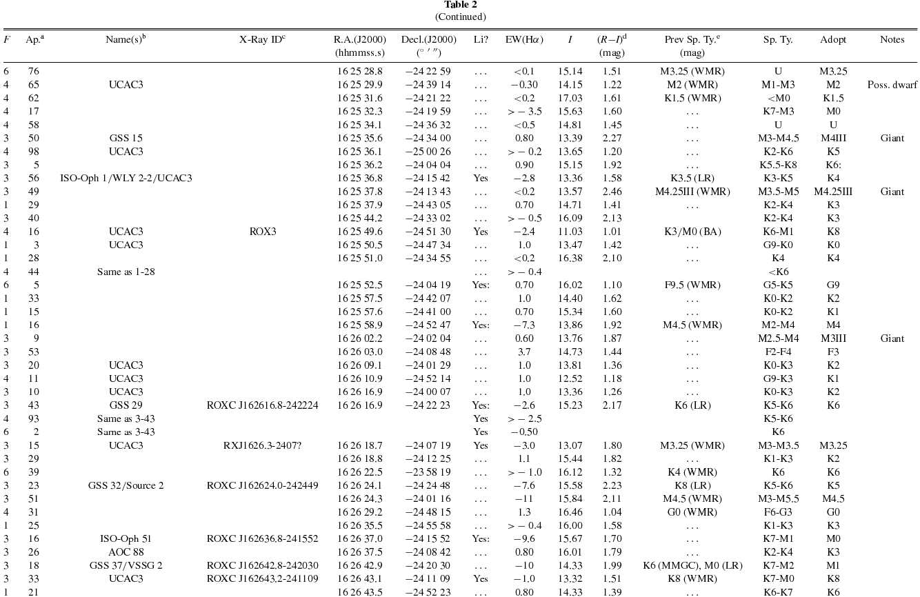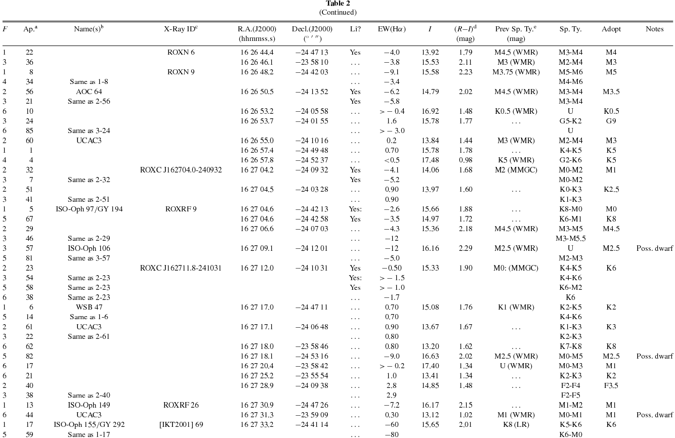 | 3 | 56 | ISO-Oph 1/WLY 2-2/UCAC3 | 16 25 36.8 | −24 15 42 | Yes | −2.8 | 13.36 | 1.58 | K3.5 (LR) | K3-K5 | K4 | ||