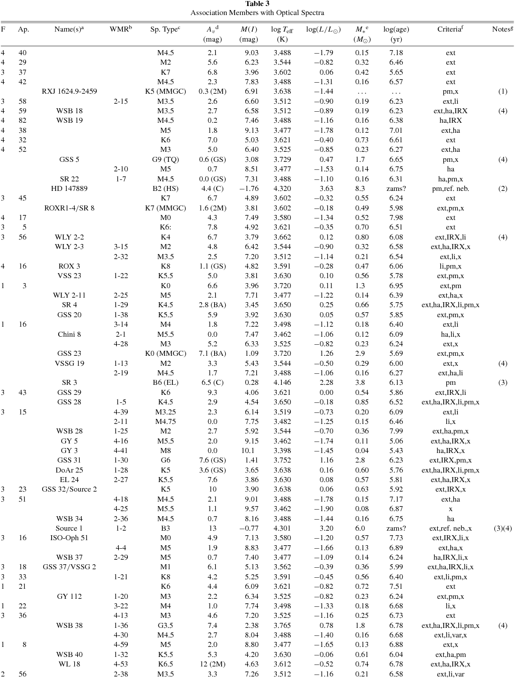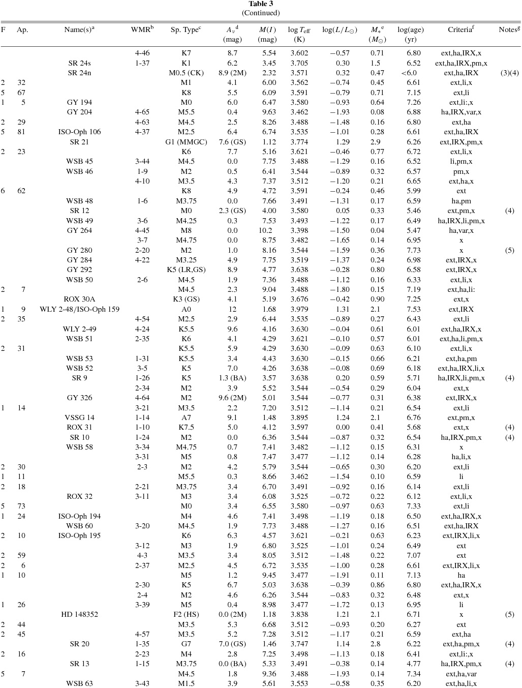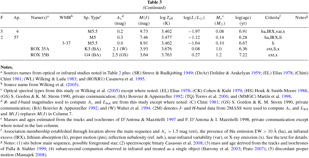 Notes. aSources names from optical or infrared studies noted in Table 2 plus: (SR) Struve & Rudkjobing 1949; (DoAr) Dolidze & Arakelyan 1959; (EL) Elias 1978; (Chini) Chini 1981; (WL) Wilking & Lada 1983; and (ROXR1) Casanova et al. 1995. bSource name from Wilking et al. (2005). cOptical spectral types from this study or Wilking et al. (2005) except where noted: (EL) Elias 1978; (CK) Cohen & Kuhi 1979; (HS) Houk & Smith-Moore 1988; (GS) S. Gordon & K. M. Strom 1990, private communication; (BA) Bouvier & Appenzeller 1992; (TQ) Torres et al. 2006; and (MMGC) Martín et al. 1998. dR- and I-band magnitudes used to compute Av and Lbol are from this study except where noted: (C) Chini 1981; (GS) S. Gordon & K. M. Strom 1990, private communication; (BA) Bouvier & Appenzeller 1992; and (W) Walter et al. 1994. (2M) denotes J- and H-band data from 2MASS were used to compute Av and Lbol and M(J) replaces M(I) in Column 7. eMasses and ages estimated from the tracks and isochrones of D'Antona & Mazzitelli 1997 and F. D'Antona & I. Mazzitelli 1998, private communication except where noted in the last column. fAssociation membership established through location above the main sequence and Av > 1.5 mag (ext), the presence of Hα emission EW > 10 Å (ha), an infrared excess (IRX), lithium absorption (li), proper motion (pm), reflection nebulosity (ref. neb.), near-infrared variability (var), or X-ray emission (x). See the text for details. gNotes: (1) sits below main sequence, possible foreground star; (2) spectroscopic binary Casassus et al. 2008; (3) mass and age derived from the tracks and isochrones of Palla & Stahler 1999; (4) subarcsecond companion observed in infrared and treated as a single object (Barsony et al. 2003; Prato 2007); (5) discordant proper motion (Mamajek 2008).