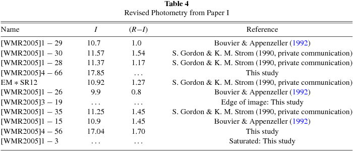 A reanalysis of the R- and I-band photometry presented in Table 2 of Paper I necessitated some revisions. These revisions, presented in Table 4, are due in large part because of saturation problems with some of the brighter association members. In these cases, photometry was adopted from other studies as noted.