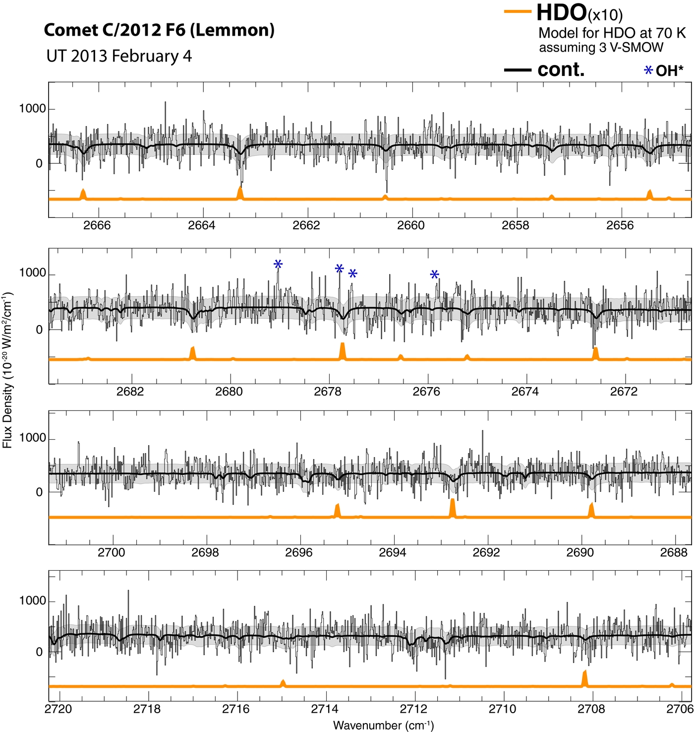 Figure 1. Water and OH prompt emission (OH*) lines detected in comet C/2012 F6 (Lemmon) on UT 2013 February 4. H2O ortho and para emission lines are identified in the spectra. Here and in Figures 2 and 3, the gray region identifies the ±1σ uncertainty, and the underlying colored lines depict the modeled spectra.