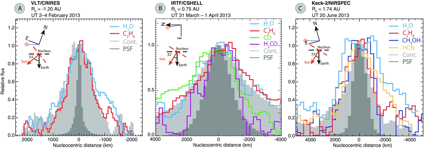 Figure 5. One-dimensional spatial profiles of primary volatiles and the continuum during the inbound (A: CRIRES) and outbound (B: CSHELL, C: NIRPSEC) passage of comet C/2012 F6 (Lemmon). The cardinal directions (i.e., the Sun–comet vector and solar phase angle) are indicated relative to the slit orientation, which is horizontal with respect to these plots. For further details, see Section 3.2.