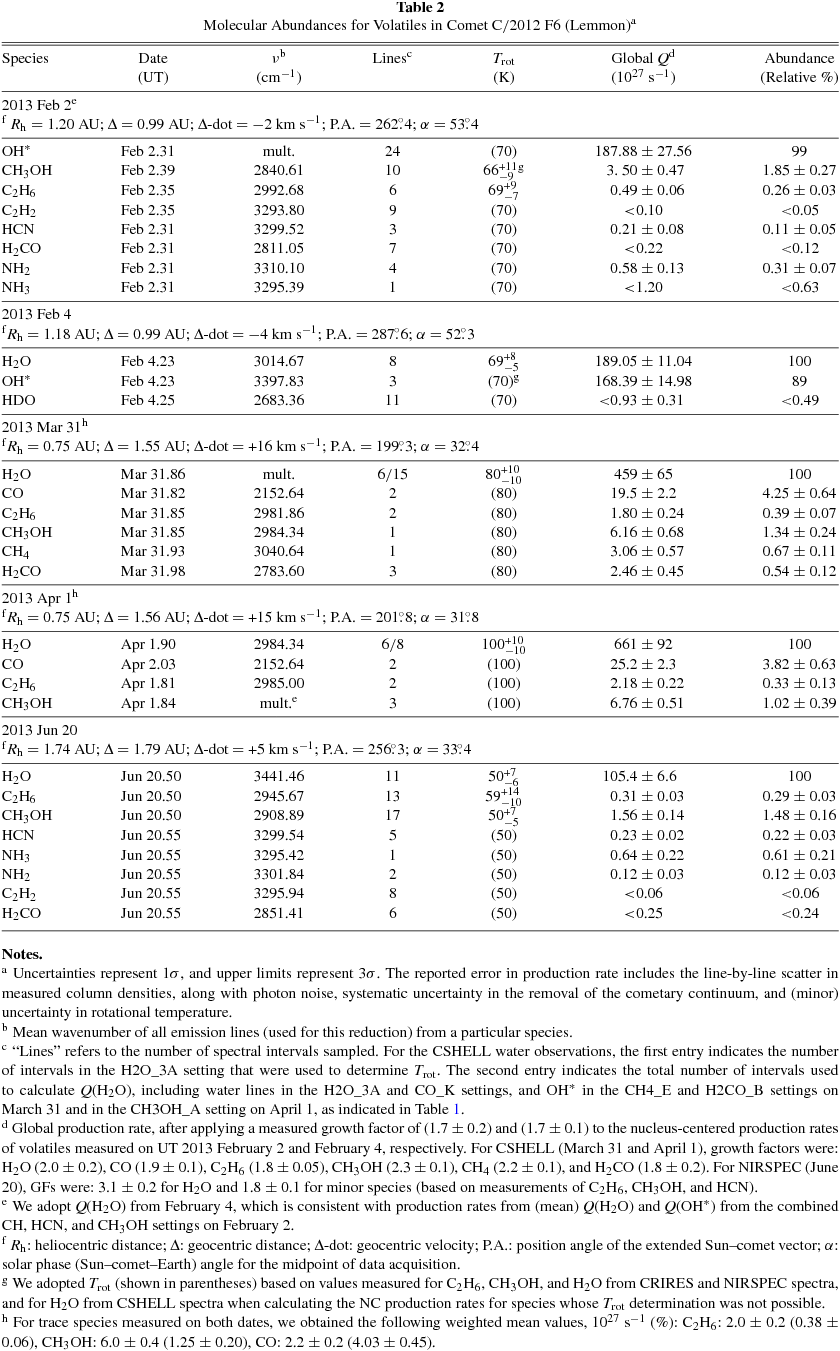 Table 2. Molecular Abundances for Volatiles in Comet C/2012 F6 (Lemmon)a