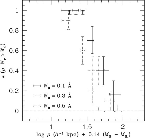 A fundamental difference in our respective measurements is that Barton & Cooke excluded observed strong Mg ii absorbers in the covering fraction calculation if the QSO spectrum did not have sufficient S/N for identifying absorbers of Wr(2796) = 0.3 Å. Of the six galaxies at ρ ⩽ 35 h−1 kpc, three have associated Mg ii absorbers of Wr(2796) = 1.93 ± 0.18 Å, Wr(2796) = 1.91 ± 0.10 Å, and Wr(2796) = 0.71 ± 0.15 Å, respectively, and three do not have corresponding Mg ii absorbers to 3σ limits of Wr(2796) < 0.3 Å. The authors excluded from the covering fraction calculation two strong absorbers, Wr(2796) = 1.93 ± 0.18 Å and Wr(2796) = 0.71 ± 0.15 Å, and derived κ0.3[ρ < 35 h−1 kpc] ∼ 0.25 based on the remaining four galaxies.