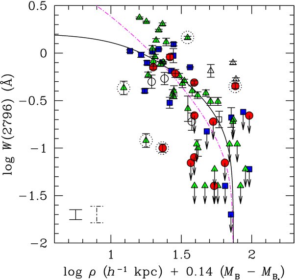 - 2.While galaxies from a “group” environment appear to occupy a similar Wr(2796) versus ρ parameter space with “isolated” galaxies, they do not exhibit a strong inverse correlation.