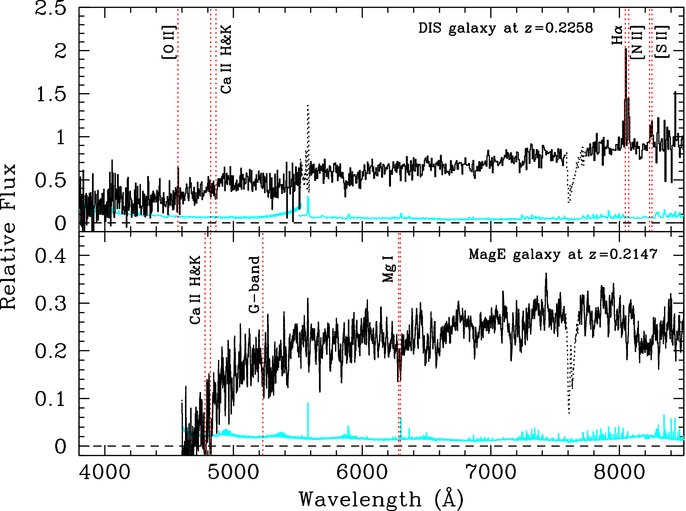 Figure 1. Top: an example DIS spectrum of a galaxy (SDSSJ130555.49+014928.62) at z = 0.2258. Bottom: an example MagE spectrum of a galaxy (SDSSJ230845.53 − 091445.97) at z = 0.2147. Contaminating sky features are dotted out. The corresponding 1σ error spectrum is shown at the bottom of each panel.