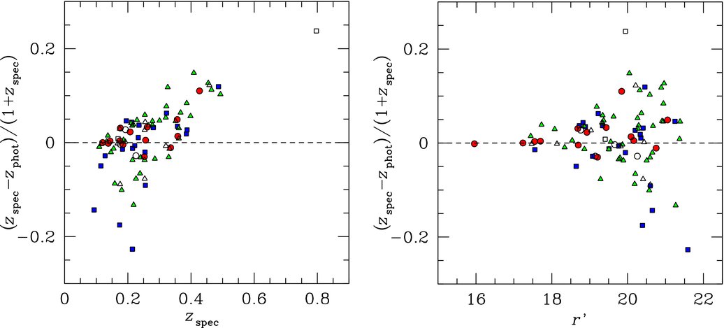 We have adopted the photometric redshifts evaluated under case “cc2” in Oyaizu et al. (2008), which included four colors u′ − g′, g′ − r′, r′ − i′, i′ − z′, and three concentration indices in the g′r′i′ bands. According to these authors, “cc2” provides the best and most realistic redshift estimates.