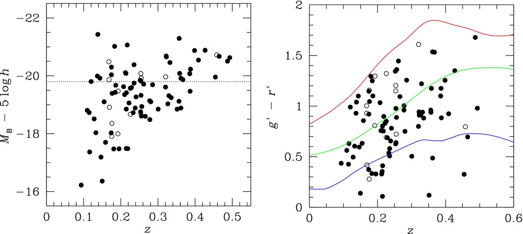 where k(z) is the k-correction term to account for the color difference between the observed g′ band and corresponding rest-frame B band. We estimate the k-correction of each galaxy using an Sbc galaxy template from Coleman et al. (1980), and adopt