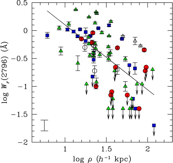 We have retrieved from the SDSS data archive the galaxy photometric and spectroscopic data in Barton & Cooke (2009), and determined the rest-frame B-band absolute magnitude and BAB − RAB color for each of the 20 galaxies according to the procedures described in Section 4.1. The rest-frame absolute B-band magnitudes of these galaxies span a range from MB − 5log h = −19.6 to MB − 5log h = −20.7 with a median of 〈MB − 5log h〉 = −20.3. The rest-frame BAB − RAB colors range from BAB − RAB ≈ 0.6 to BAB − RAB ≈ 1.2 with a median of 〈BAB − RAB〉med ≈ 1.0. Figure 13 displays the observed Wr(2796) versus ρ relation for the Barton & Cooke sample, superimposed on top of our own data. We have converted the 3σ upper limits published by these authors to 2σ upper limits in order to be consistent with our own measurements.