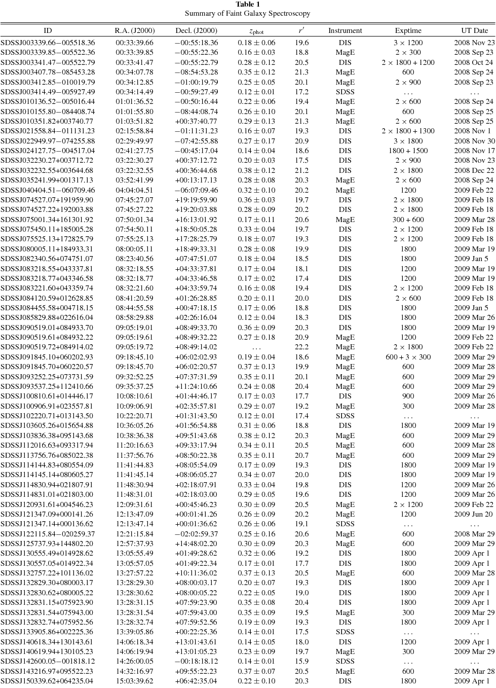| SDSSJ093537.25+112410.66 | 09:35:37.25 | +11:24:10.66 | 0.24 ± 0.08 | 20.4 | MagE | 600 | 2009 Mar 29 |