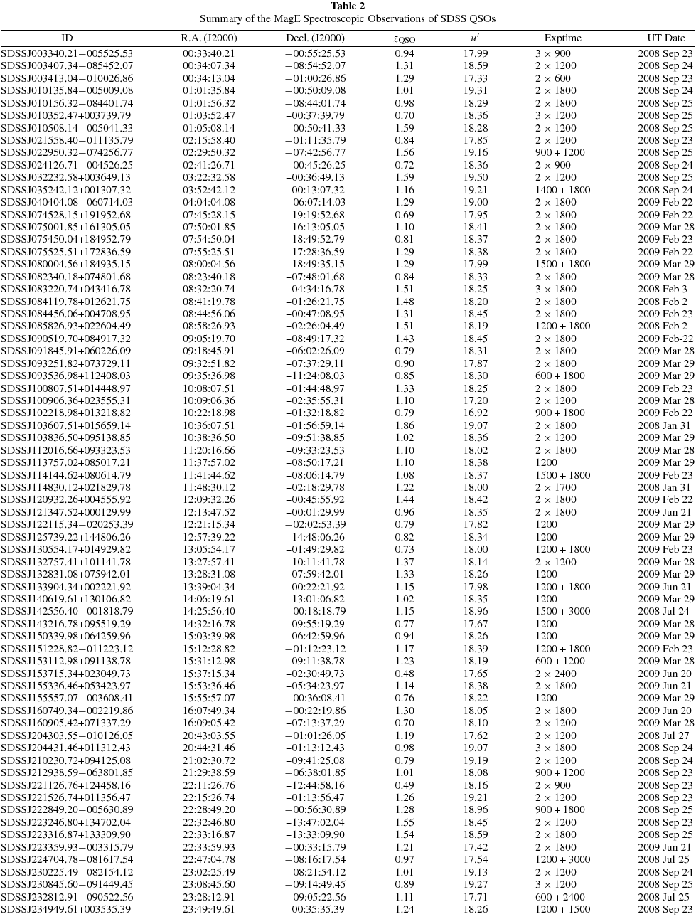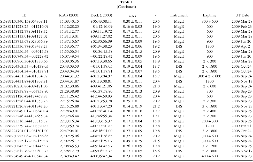 | SDSSJ010136.52 − 005016.44 | 01:01:36.52 | −00:50:16.44 | 0.22 ± 0.06 | 19.4 | MagE | 2 × 600 | 2008 Sep 24 |