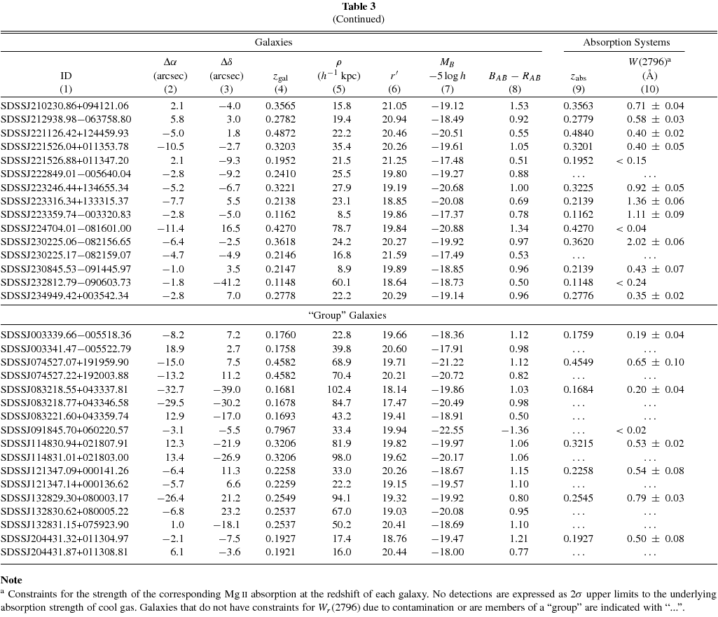 In addition, Barton & Cooke (2009) have recently carried out a search of coincident Mg ii absorbers in the vicinity of 20 luminous galaxies (Mr − 5 log h ⩽ −20.5) identified at z ∼ 0.1 in the SDSS galaxy spectroscopic sample. The authors reported a low gas covering fraction of κ0.3[ρ < 75 h−1 kpc] ≲ 0.4 and κ0.3[ρ < 35 h−1 kpc] ∼ 0.25 for Mg ii absorbers of Wr(2796) ⩾ 0.3 Å. These results are inconsistent with the high gas covering fraction found in our survey. The design of the Barton & Cooke survey is very similar to ours presented here, with only small differences in the targeted redshift range (z ∼ 0.1) and luminosity scale (>L*). The discrepancy in the observed gas covering fraction therefore requires further perusal.