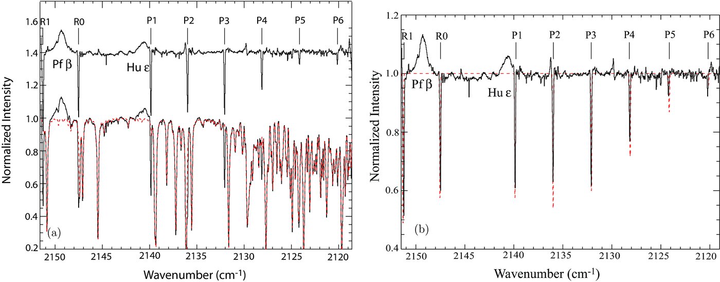 Figure 1. (a) Normalized M-band spectrum of MWC 1080. The red, dashed line overplotted is the telluric model. Plotted above the spectrum is the residual, the difference between the data and the model. The 12CO (1–0) absorption lines are labeled (solid ticks) and are rapidly disappearing by P6. (b) Residual of MWC 1080, corrected for atmospheric transmittance (solid line) with the best-fit model overplotted (red dashed line, N(CO) = 1.1 × 1017 cm−2, Trot = 23 K, nH > 105 cm−3) as discussed in Section 3.