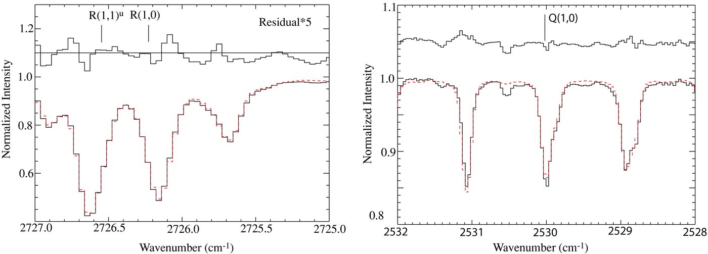 Standard image High-resolution imageIn Figure 3(b), we show the tellurically corrected residual. Overplotted is the synthetic spectrum derived using the model described in Section 3.1 with nH = 250 cm−3 and TH = 60 K, a typical hydrogen density and temperature in diffuse clouds. This model reproduces the CO absorption spectrum observed toward MWC 349, though we note that an equally good fit can be found with a higher density and lower hydrogen temperature (nH = 900 cm−3 and TH = 23 K).