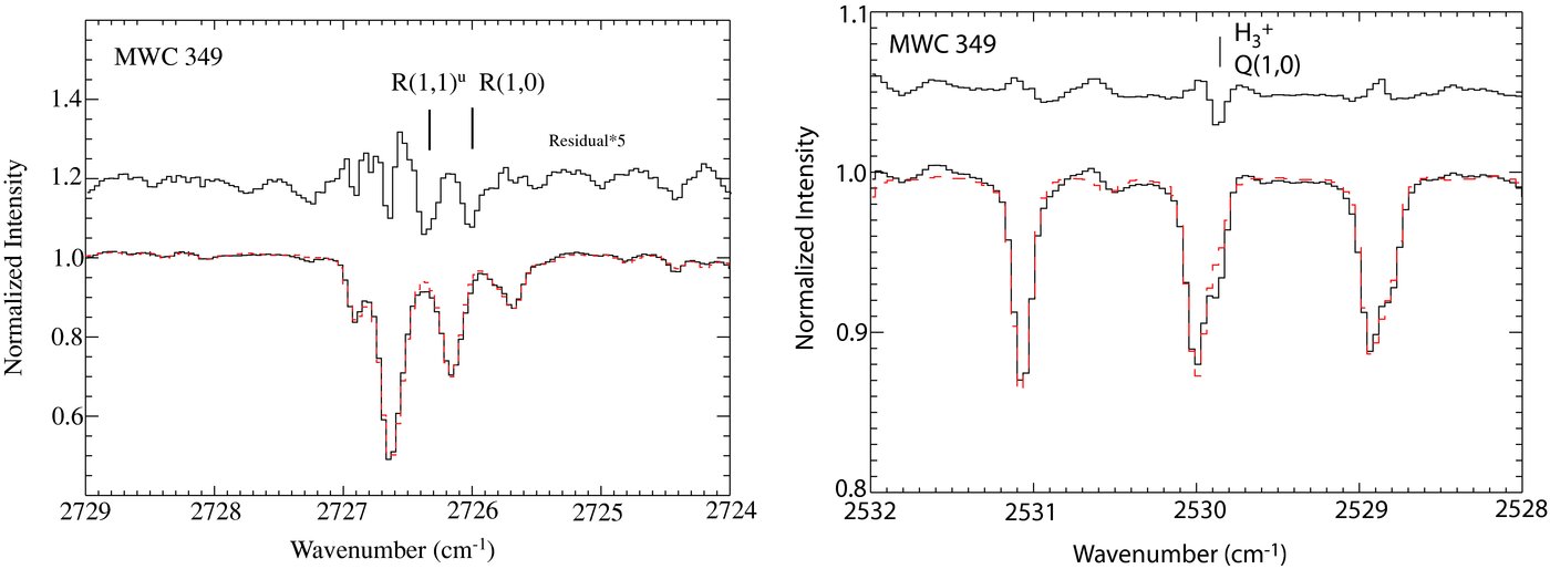 As shown in Figure 4, we detected the R(1,1)u and R(1,0) doublet and the Q(1,0) transitions of H+3 in absorption toward MWC 349A. The line equivalent widths and resulting column densities are shown in Table 5. We found N(H+3) = (3.9 ± 1.3) × 1014. The ortho-to-para ratio (0.3235) results in a Tex∼ 22 ± 5 K, consistent with a cold, diffuse interstellar origin, much like the CO. This temperature agrees within uncertainty with the 27 K found by McCall et al. (2002) toward Cyg OB2 No. 12.
