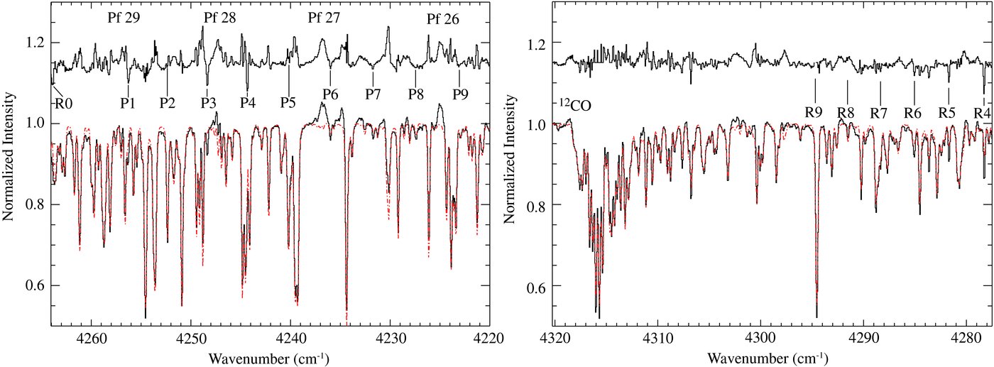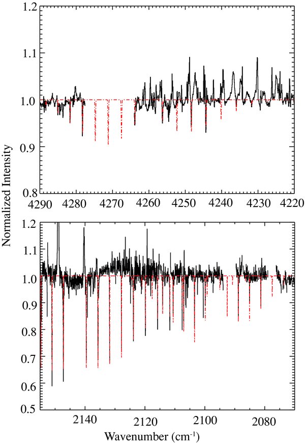 Standard image High-resolution imageFigure 6. LkHα 101 M-band spectra showing the 12CO (labeled below the residual) and 13CO (labeled above the residual) fundamental absorption lines. The solid line is the spectrum. The red, dashed line is the telluric model. Plotted above the spectrum is the residual, displaced vertically for clarity. The strong emission lines near 2149 and 2141 cm−1 are due to hydrogen Pf β and Hu