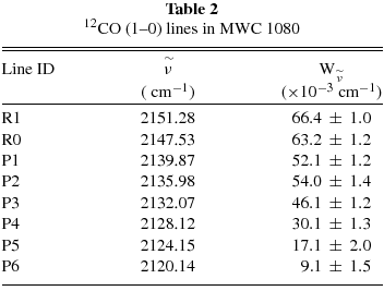 Figure 1(a) shows a high-resolution M-band spectrum of MWC 1080. Strong absorption lines of 12CO (1–0) and weak 12CO (2–1) emission lines are present. The emission lines are attributed to hot CO gas in the inner circumstellar disk of MWC 1080 and further analysis of them is beyond the scope of this paper. The strong, broad emission lines near 2149 cm−1 and 2141 cm−1 are due to hydrogen Pf β and Hu