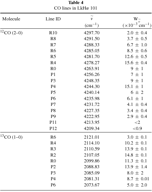 However, if there is enough diffuse material along the line of sight to LkHα 101 to provide 3.5 mag of visual extinction, we estimate that the overall CO column density contributed by this material should be approximately 2 × 1014 to 2 × 1016cm−2, depending on the assumed CO/H2 ratio, or up to 1% of the overall CO. The interstellar DIBs and Na I observed toward NGC 1579 have the same heliocentric Doppler shift as the CO (Herbig et al. 2004; Knappe et al. 1976; Mitchell et al. 1990), so we would not be able to resolve this CO component in our NIRSPEC observations. Hence, we conclude that such a small contribution of CO would be well hidden in our highly saturated CO absorption lines, and the CO analysis does not preclude a contribution from a modest diffuse interstellar cloud toward LkHα 101.