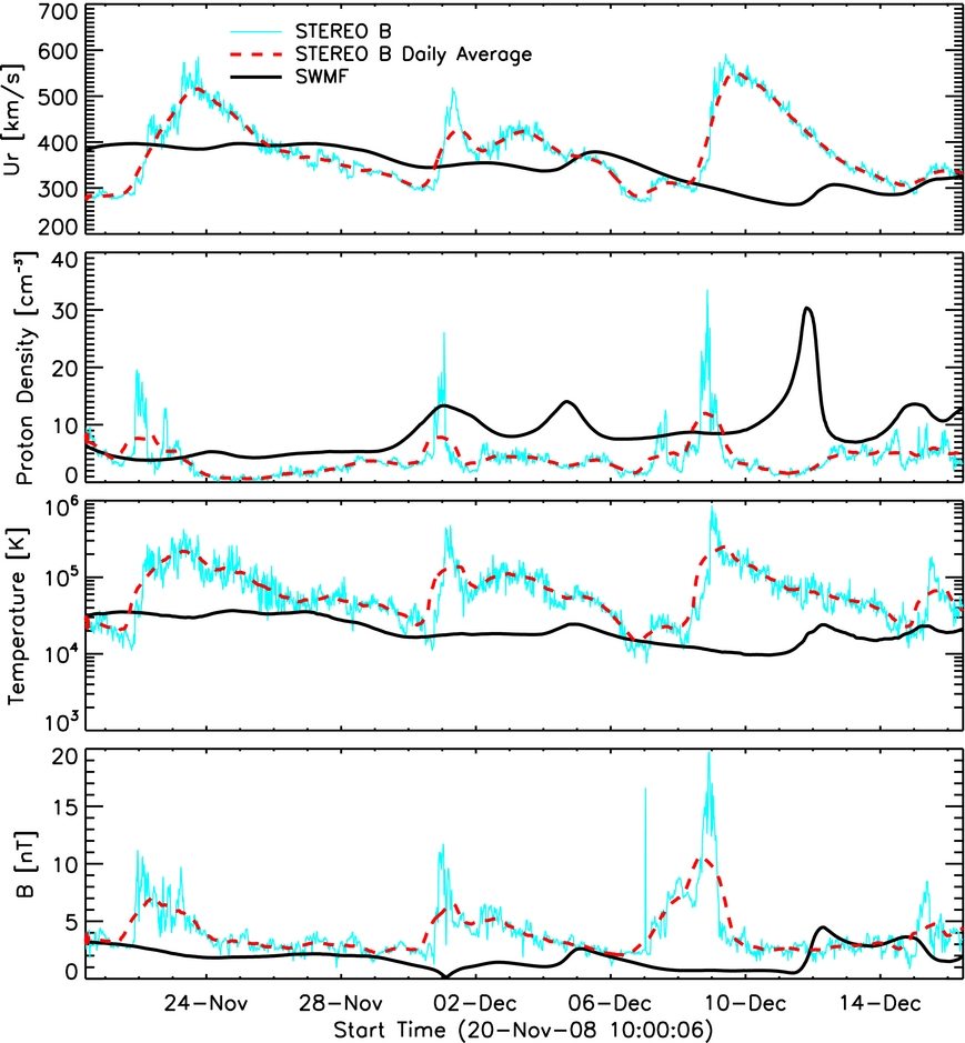 Standard image High-resolution imageFigure 11 shows the comparison between the model and the STEREO A observation. The proton parameters are observed by the Plasma and Supra-Thermal Ion Composition Investigation instrument on board STEREO. The magnetic field data is provided by the In-situ Measurements of Particles and CME Transients instrument onboard STEREO. The cyan lines in the figure show the original observational data with a time resolution of 10 minutes. There are many fine structures that cannot be captured by the steady-state MHD solutions. In order to compare the model output with the observation, a daily average of the observational data is shown with red dashed lines. In general, our model agrees to within a factor of two with STEREO observations in all the comparison parameters but some peaks are missing in our model. Some of these peaks might be related to eruptive events in the heliosphere that cannot be simulated by the steady-state solar wind model. Similar results are shown in Figure 12 for the comparison between the model and STEREO B observations.