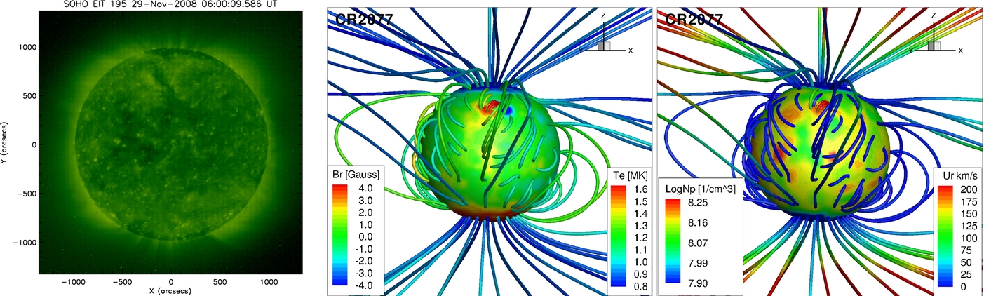 Figure 1. Comparison between the SC output and SOHO/EIT observation. Left: SOHO/EIT 195 Å observation on 2008 November 29. Middle: radial magnetic field at r = 1.055 R☉ with selected field lines. The field lines are colored by the electron temperature. Right: proton density at r = 1.055 R☉ with selected field lines. The field lines are colored by the radial solar wind velocity.