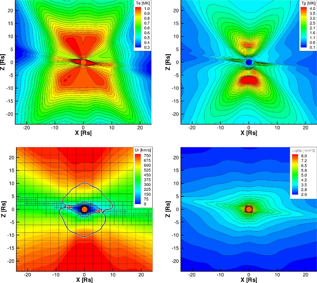 Figure 2. Meridional slice of the SC showing the electron temperature (top left), proton temperature (top right), radial solar wind velocity (bottom left), and proton density (bottom right). The square boxes in the velocity figure represent the grid blocks, showing adaptive mesh refinement near the Sun and the current sheet. The white contour line shows the critical surface where the solar wind speed equals the poloidal Alfvén speed. The black (red) contour line shows the critical surface where the solar wind speed equals the poloidal fast (slow) magnetosonic-wave speed.