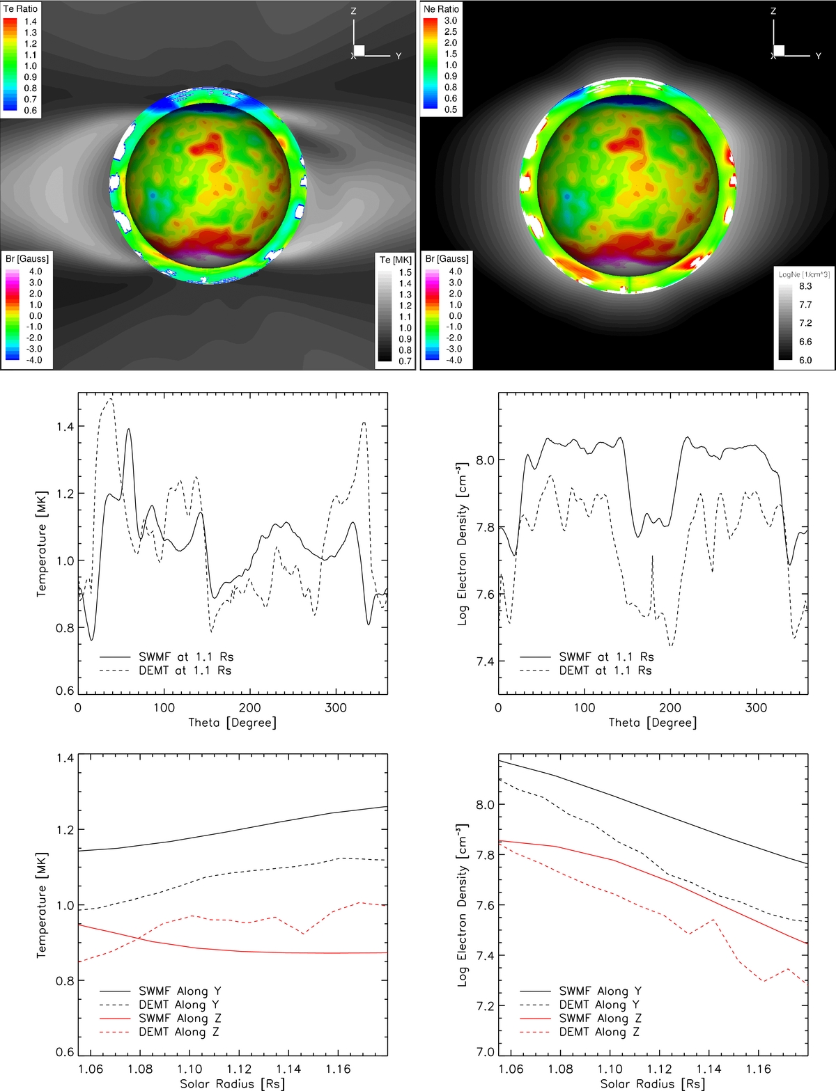 Figure 3. Comparison between the meridional slices of the SC and DEMT output near the Sun for electron temperature (left panel) and log electron number density (right panel). The inner ring shows the ratio between the model and DEMT output from 1.035 R☉ to 1.225 R☉ and outside background shows the model output. The iso-surface of the Sun is taken at R = 1.055 R☉ with the radial magnetic field shown at that layer. Middle left: model and DEMT electron temperature at 1.1 R☉. Middle right: model and DEMT electron number density at 1.1 R☉. The angle is measured clockwise from positive Z-direction. Bottom left: model and DEMT electron temperature along Y- and Z-axes. Bottom right: model and DEMT-derived electron number density along Y- and Z-axes.