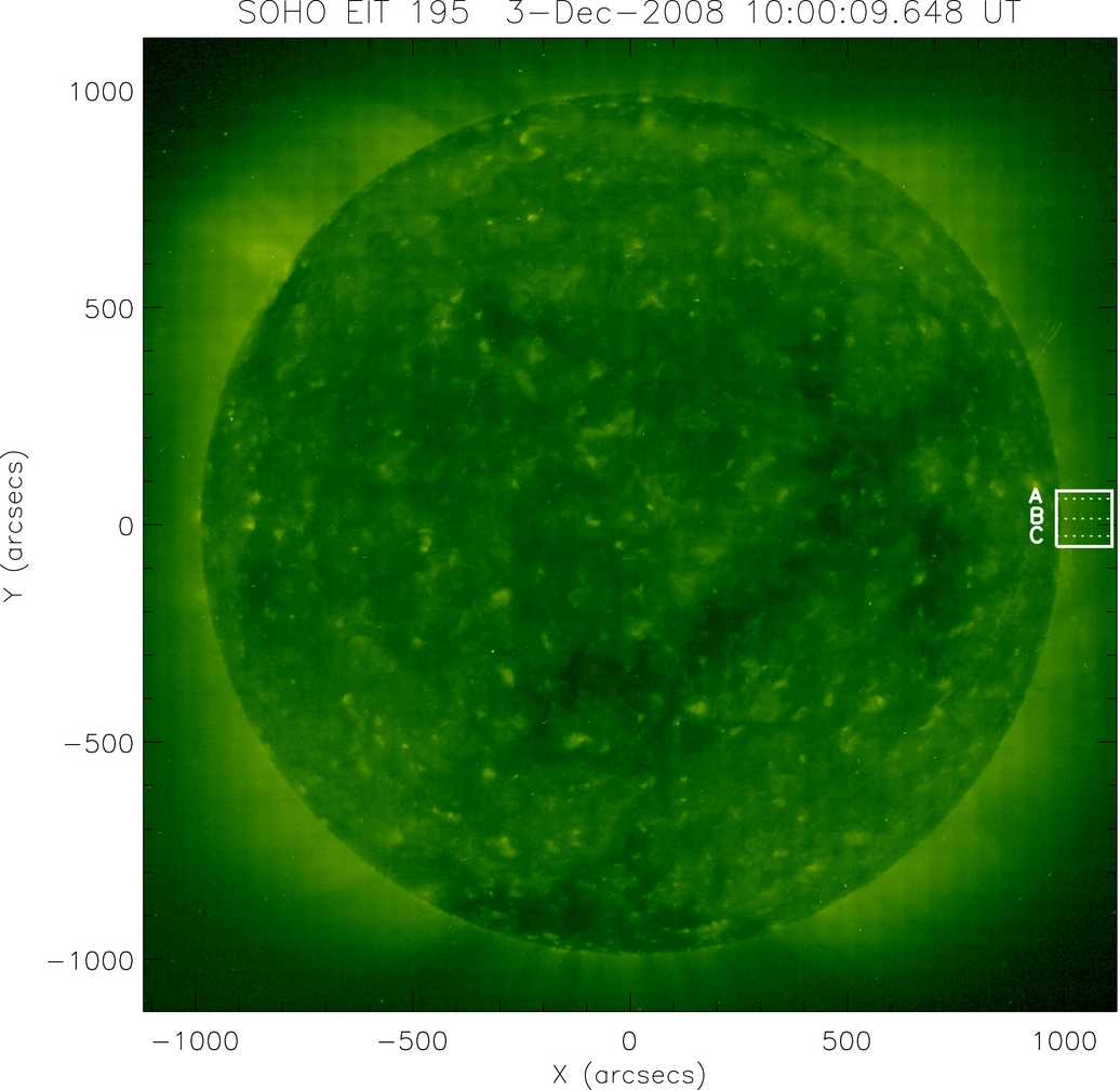 Standard image High-resolution imageFigure 4 shows the EUV image observed by SOHO/EIT on 2008 December 3. The white box shows the EIS field of view. The EIS observation suggests that the field of view is quite unstructured at transition region (i.e., Fe viii) temperatures, but shows two brighter areas and a darker lane at coronal temperatures. We have thus selected three data sets ("A," "B," and "C") to carry out the analysis, each including one of these features, and averaged the observed emission along the N–S direction at each position in the E–W scan. The position of the these three regions are marked by white dashed lines in Figure 4. The resulting data set consisted of three series of full EIS spectra as a function of height. The signal to noise becomes so low above 1.08 R☉ that line intensities are too uncertain to derive physical properties of the emitting plasma. We are also interested only in data above 1.02 R☉, to match the lowest height reached by tomographic reconstructions. We thus studied the spectra in the 1.02–1.07 R☉ range only.